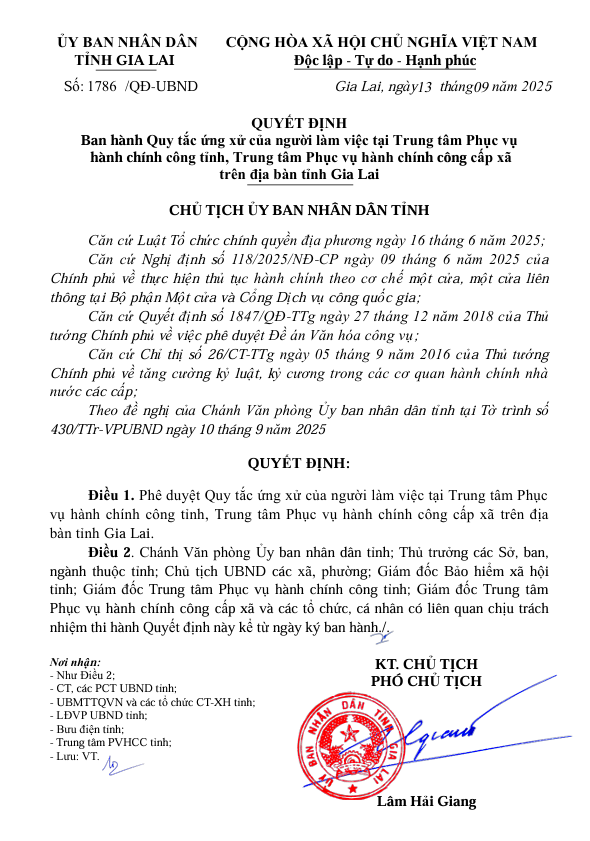 Thứ ba, 28/10/2025 | 08:02 A- A A+ | Ban hành Quy tắc ứng xử của người làm việc tại Trung tâm Phục vụ hành chính công tỉnh, Trung tâm Phục vụ hành chính công cấp xã trên địa bàn tỉnh Gia Lai Chia sẻ Đọc bài Lưu Quy tắc ứng xử của người làm việc tại Trung tâm Phục vụ hành chính công tỉnh, Trung tâm Phục vụ hành chính công cấp xã trên địa bàn tỉnh Gia Lai (Chi tiết)