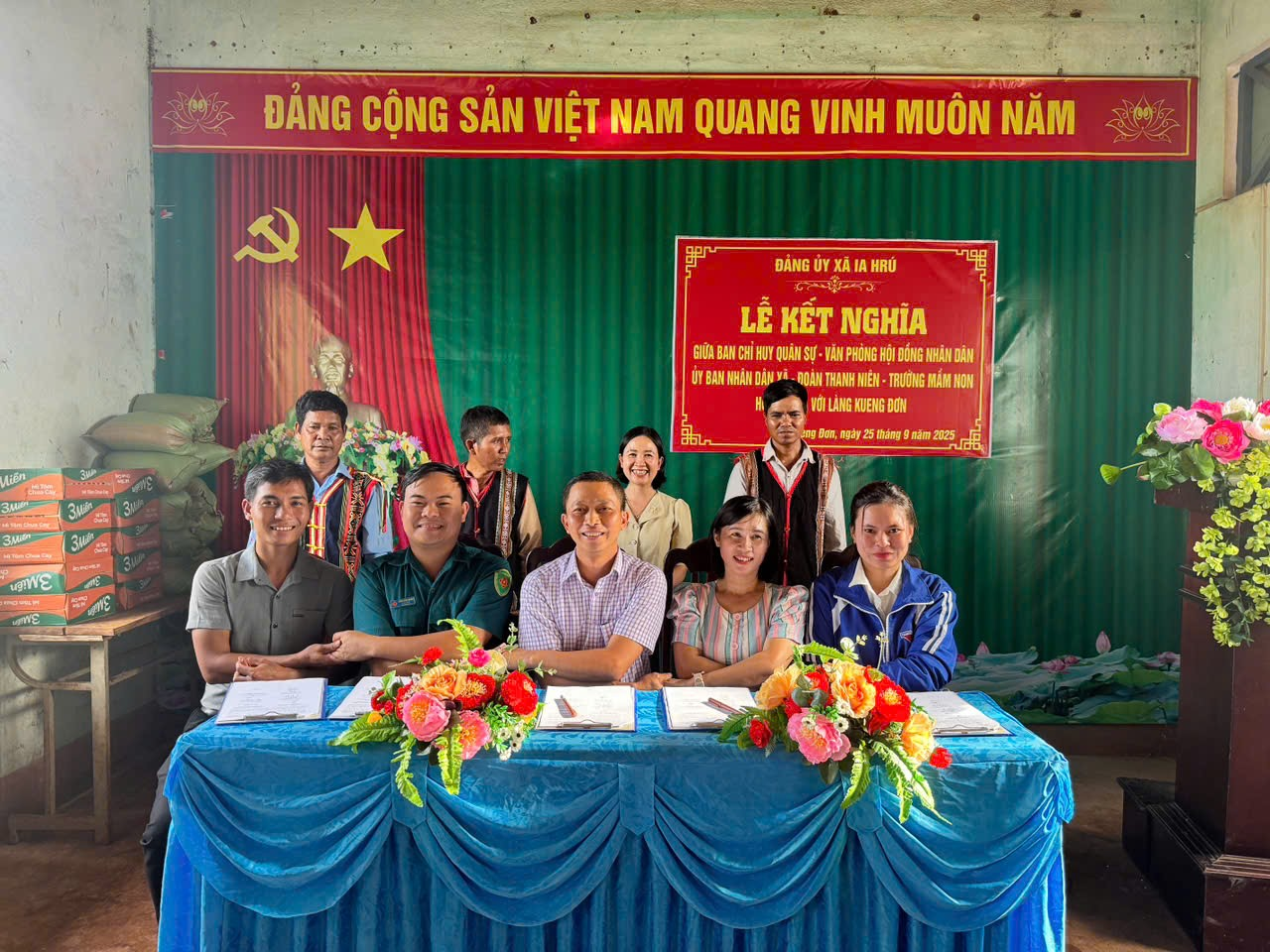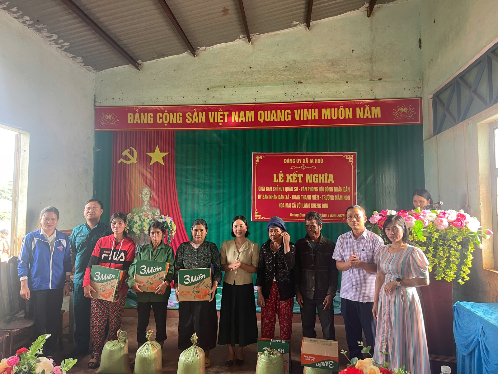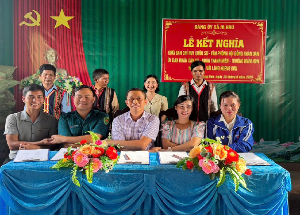 Thực hiện Quyết định số 131-QĐ/ĐU, ngày 20 tháng 8 năm 2025 của Ban Thường vụ Đảng ủy xã Ia Hrú về việc phân công các cơ quan, đơn vị kết nghĩa với các thôn, làng đồng bào dân tộc thiểu số trên địa bàn xã; Thực hiện Kế hoạch số 50/KH-BCH, HĐND-UBND, ĐTN, TMNHM, ngày 15 tháng 9 năm2025 của Ban Chỉ huy Quân sự, Văn phòng HĐND và UBND, Đoàn Thanh niên, Trường Mầm non Hoa Mai xây dựng kế hoạch kết nghĩa với làng Kueng Đơn. Theo đó, làng Kueng Đơn là thôn đặc biệt khó khăn của xã Ia Hrú, với 174 hộ, 889 nhân khẩu (trong đó dân tộc Jrai 92 hộ, tỷ lệ hộ nghèo, cận nghèo trên địa bàn làng vẫn còn ở mức cao với 30 hộ nghèo, 11 hộ cận nghèo). Đời sống bà con phụ thuộc vào kinh tế nông nghiệp, trồng mía, trồng cây ngắn ngày và chăn nuôi bò.